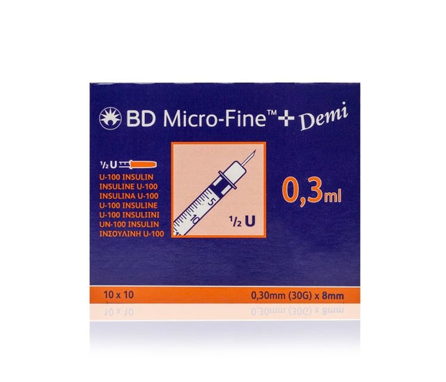 BD 0.3 mL syringes are for insulin doses under 30 units of insulin and are numbered at 1-unit intervals.