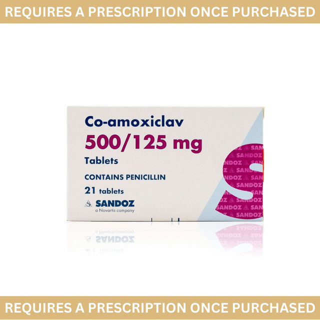 Co-Amoxiclav is a combination form of antibiotic used for bacterial infections. It contains Amoxicillin (a form of penicillin) and Clavulanic Acid which stops the bacteria from breaking down the Amoxicillin, allowing the antibiotic to work better.
