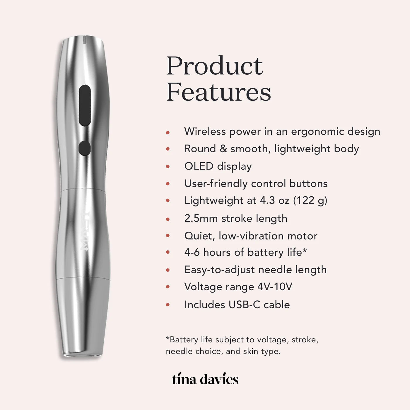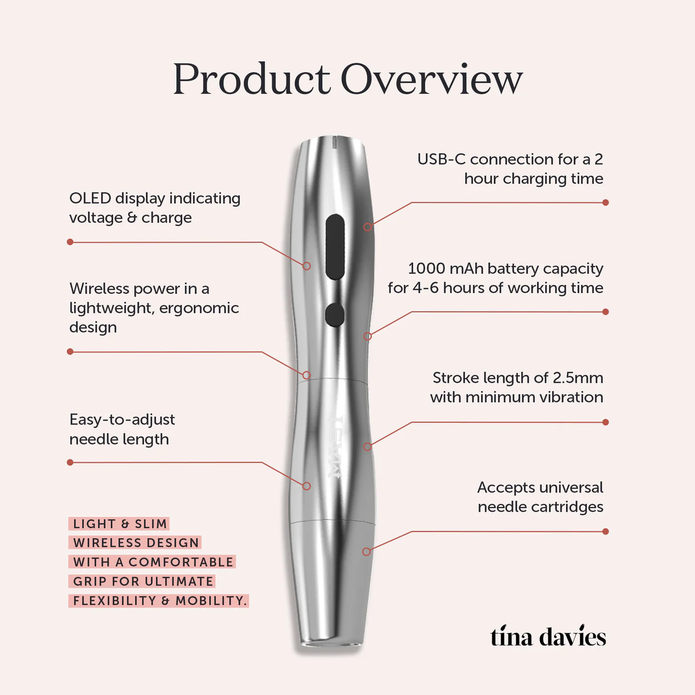 We bring to you the Mast P20, curated by Tina Davies for comfort, performance, and value. Whether beginner or seasoned, this lightweight, wireless machine is a perfect fit in every artist’s hand. Features a light & slim design with even better ergonomics making it easier to operate while its uniquely rounded silhouette and quiet-running motor provide absolute comfort while you work.
